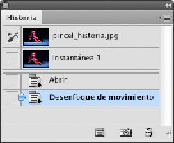 Esta herramienta trabaja asociada al panel Historia. En este panel, que ya estudiamos en el Capítulo 2, Deshacer y el panel Historia, se van anotando las acciones que realizamos: a cada una de las líneas de este panel, que corresponde a una acción realizada, le llamaremos estado de historia. También vimos que se puede tomar instantáneas de un estado de historia.