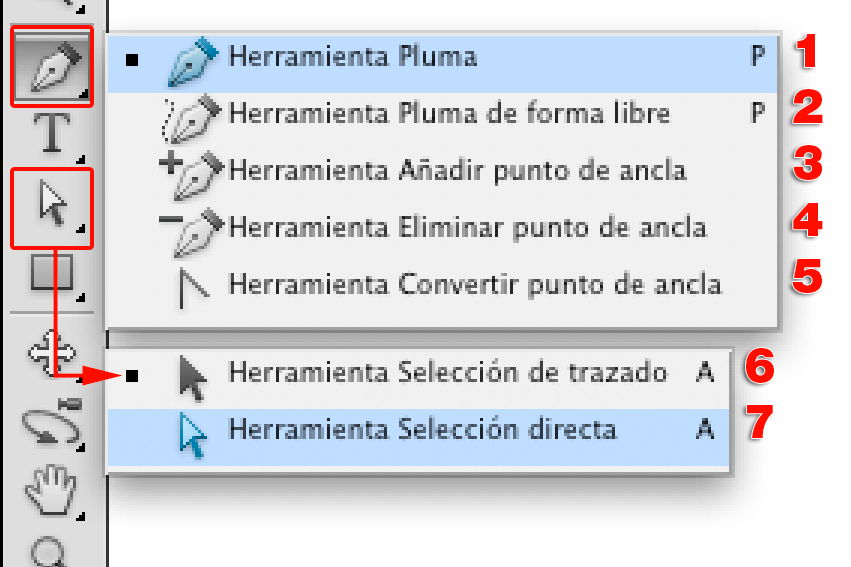 En la figura 2 vemos las herramientas que componen este conjunto, a las que deberemos agregar las herramientas Selección de trazados (puntero negro) y Selección directa (puntero blanco). Veamos las funciones de estas herramientas: